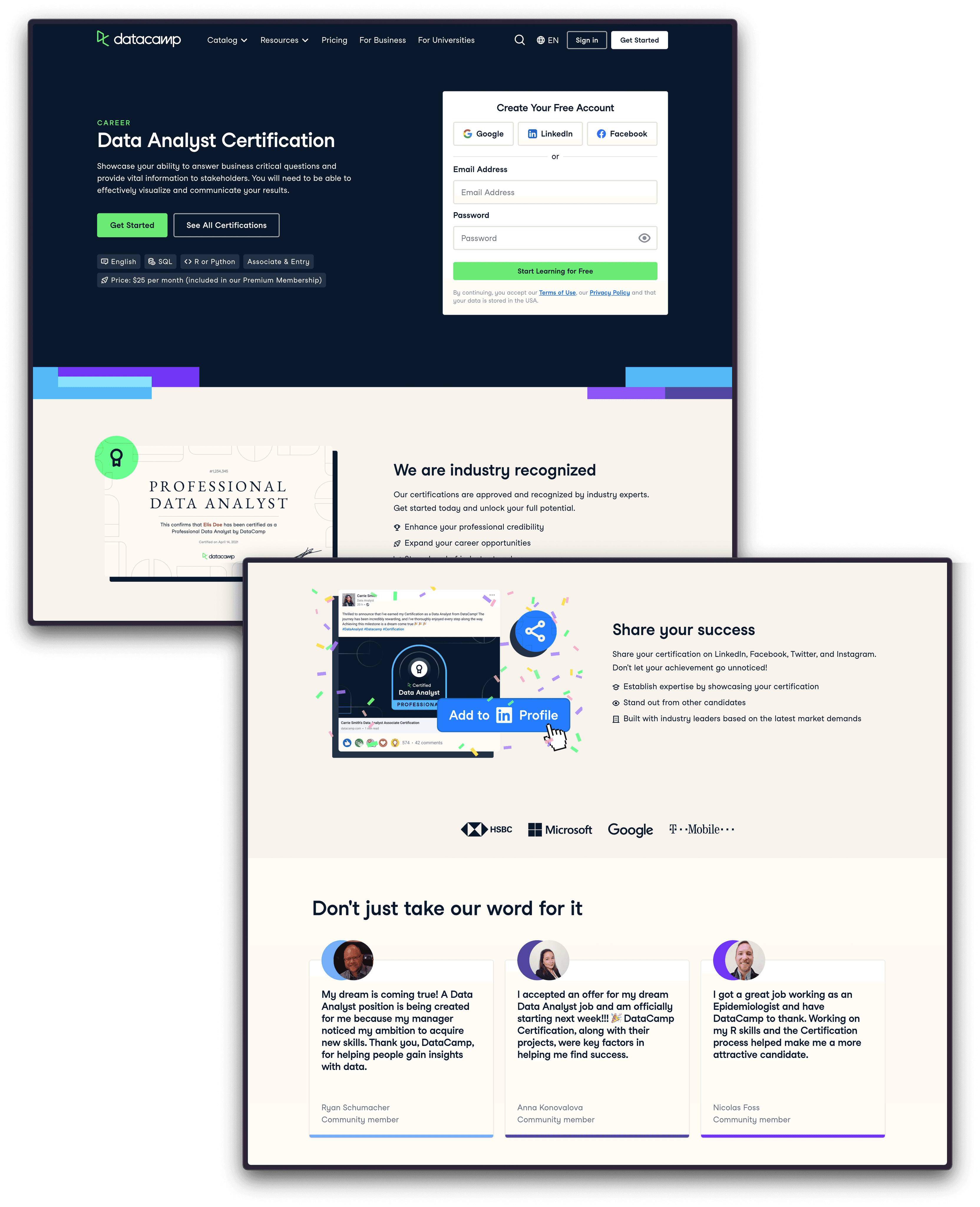 To reassure users that they are in the right place, and that other people have taken our Certifications before and benefitted from them. I spoke to users in our Certification community and created testimonials out of some success stories.