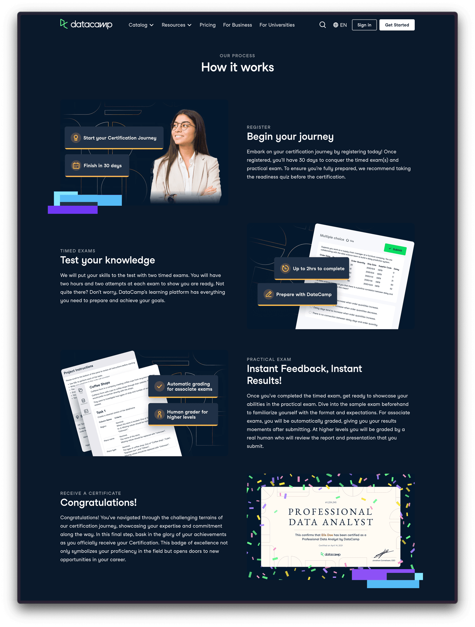 We had generally quite low registration rates for our Certifications. People weren't aware that we had them, weren't signing up to DataCamp for them, and if they did find our product, weren't registering. We found a lot of gaps in the experience from discovering our product, to taking the Certification, so we redesigned it.