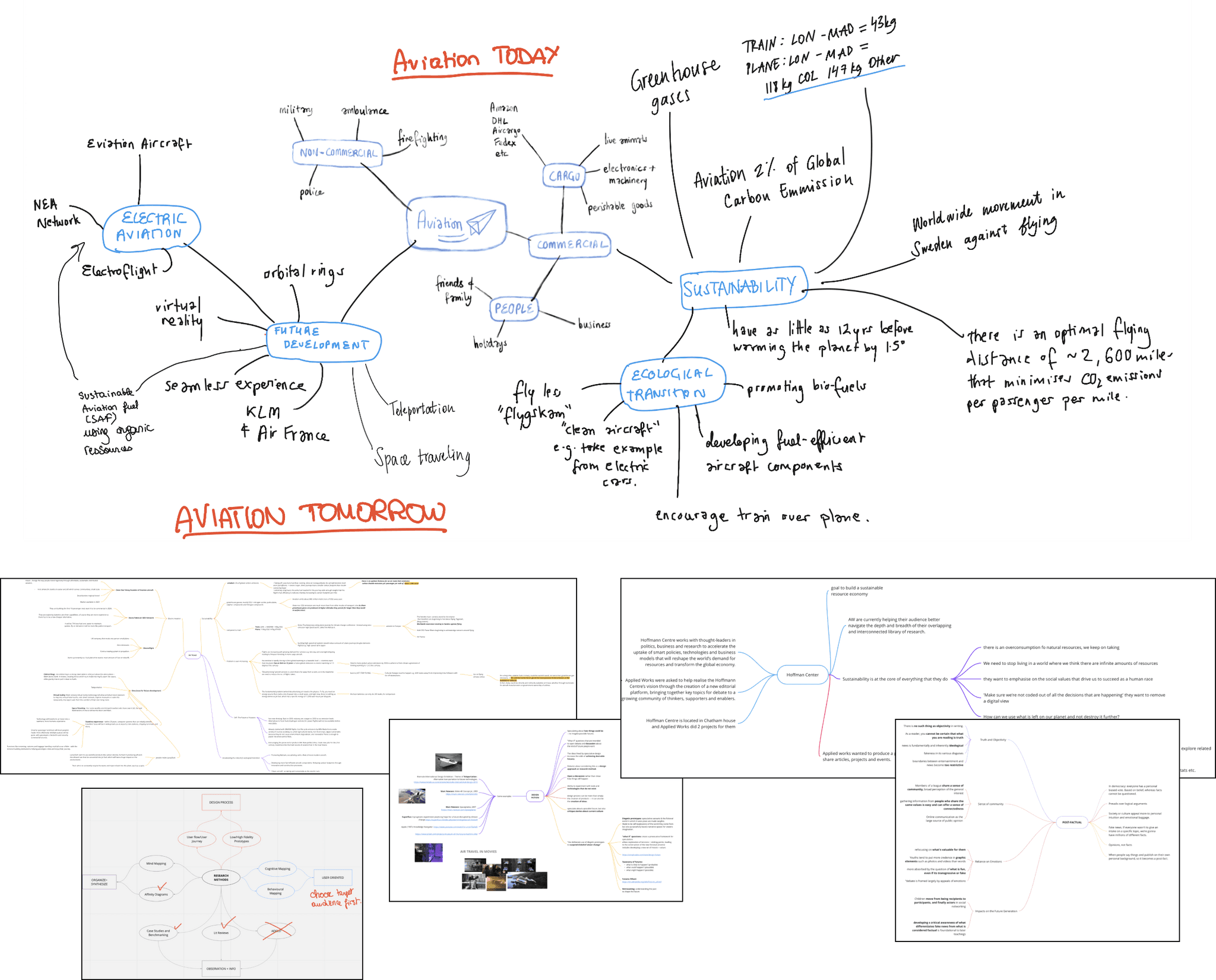 Miro mindmaps on Air Travel, the Hoffmann Centre, Design Fiction, Post-Factual Audiences and Research Methods made by the whole team.