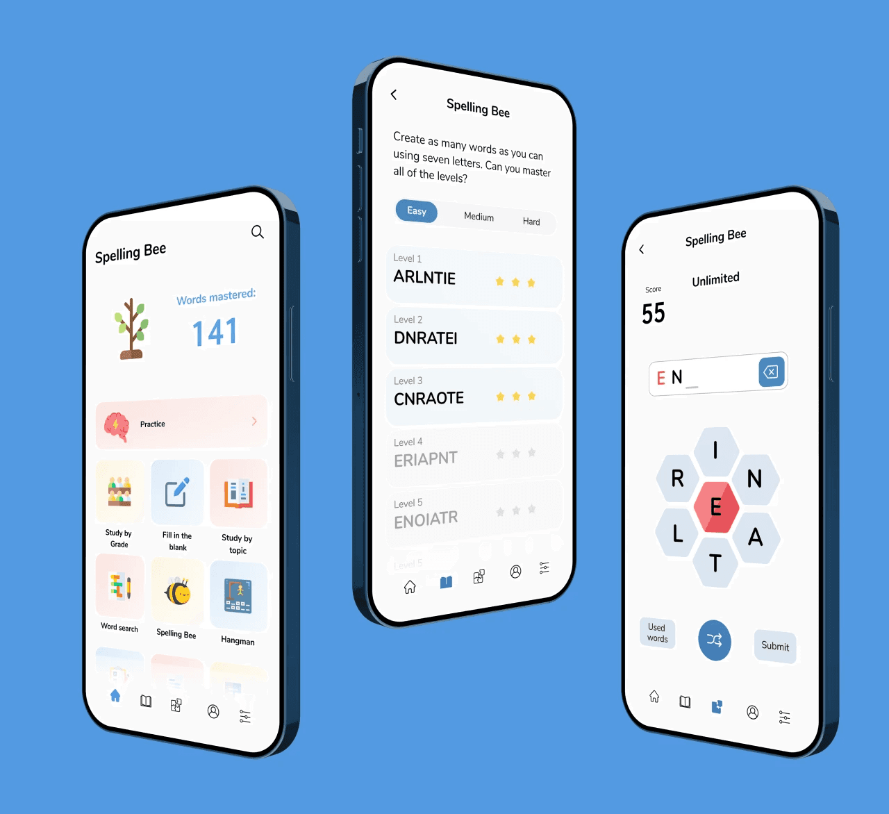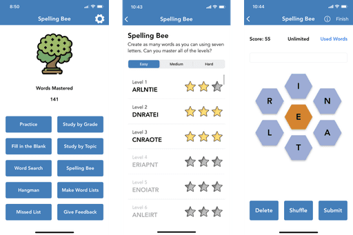 A redesign for Spelling Bee, an app that gamifies learning how to spell.